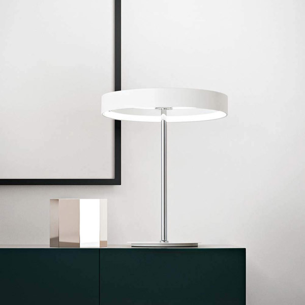 Lampada moderna da tavolo a LED con base di appoggio e struttura in metallo, finitura cromo lucido.
